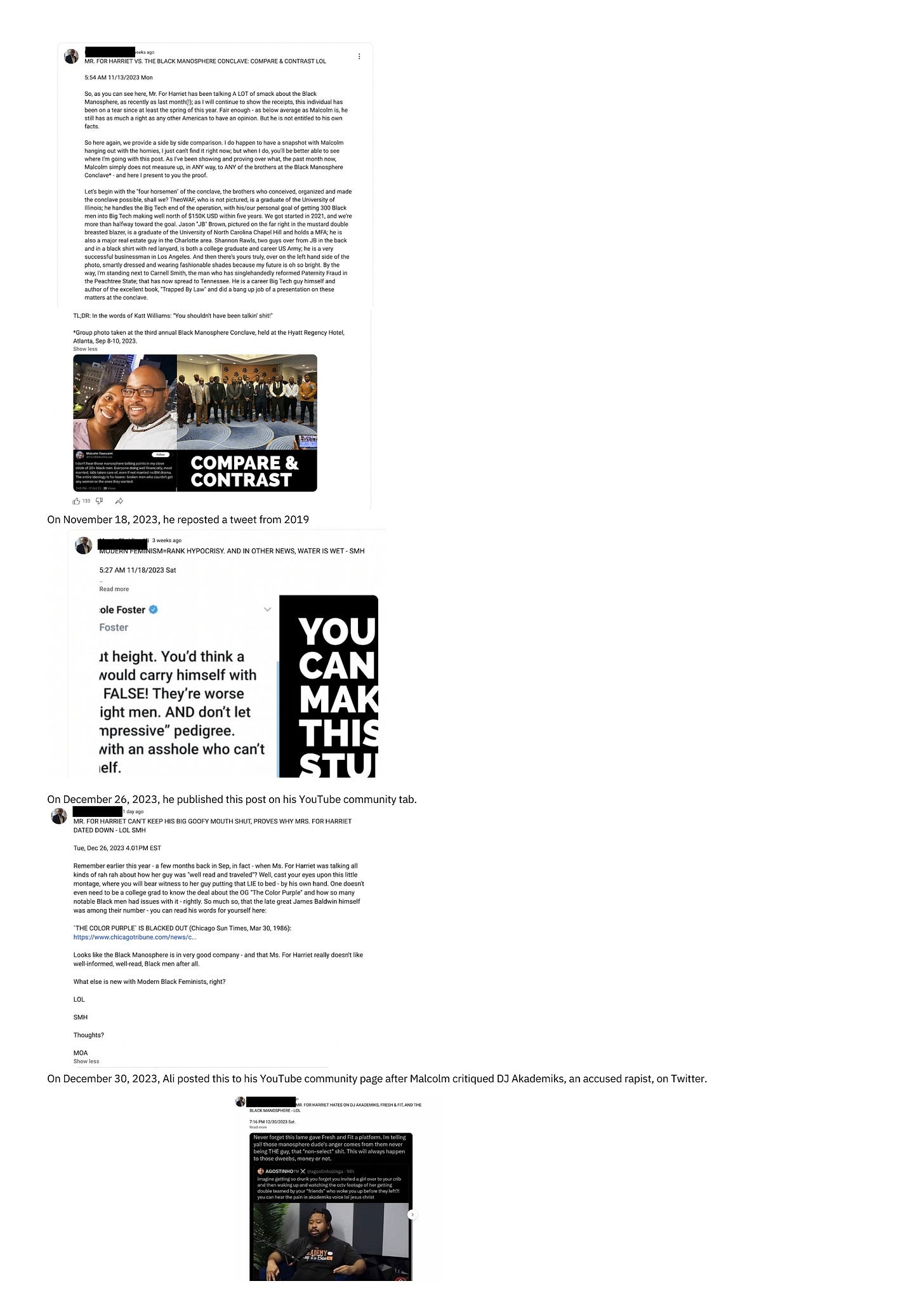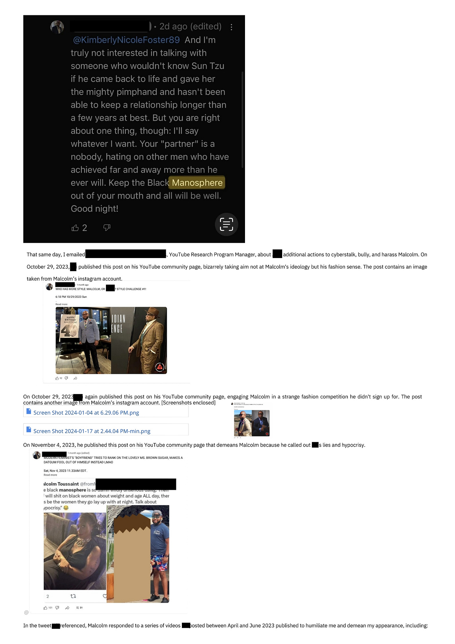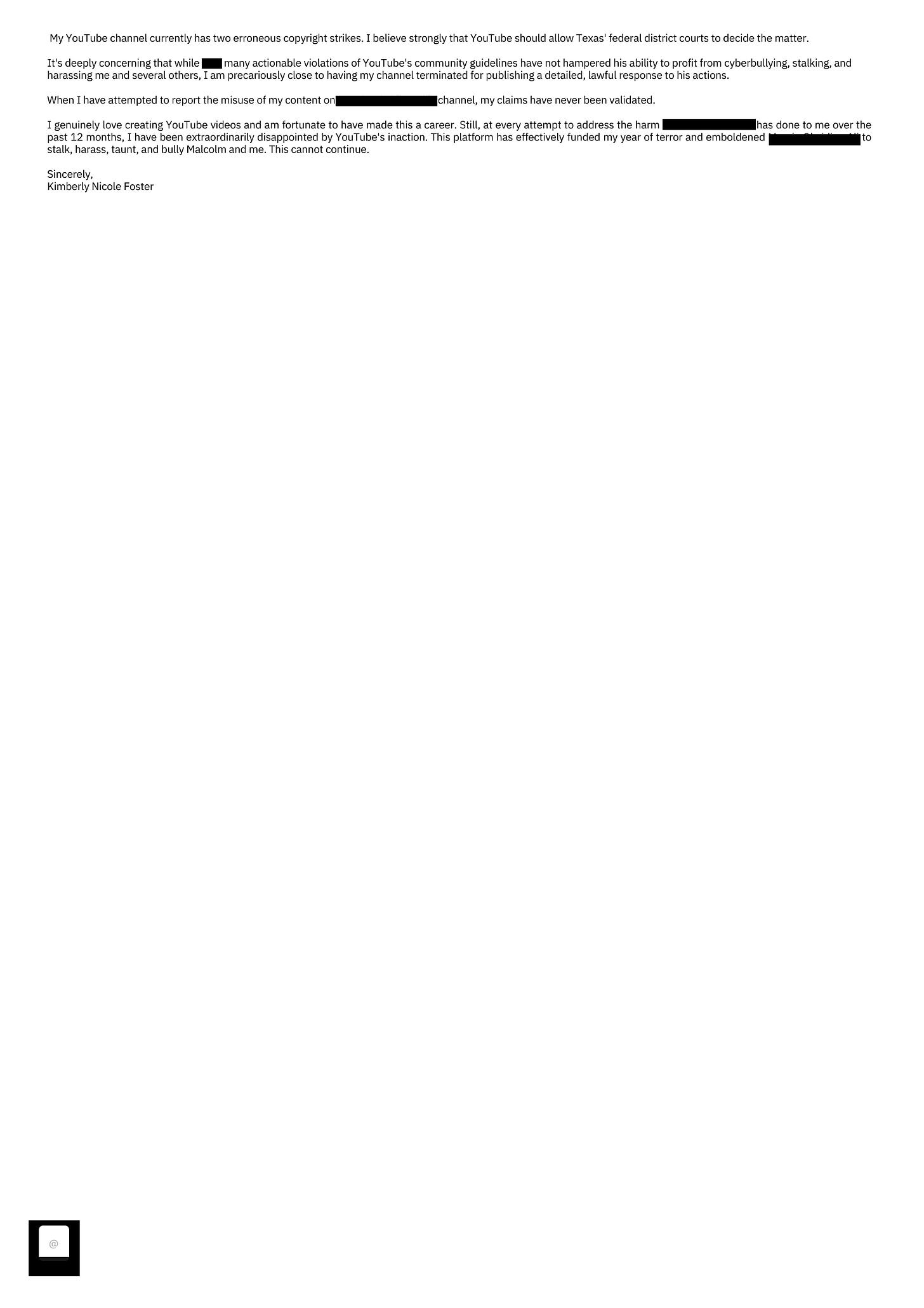 Please note that Mark’s harassment of me extends far beyond YouTube. This email only contains actions germane to his violations of YouTube’s policies and community guidelines.